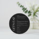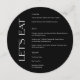 Modern wedding menu card with unique typography for "Let's Eat" and your wedding menu in clean sans serif font. Classic solid black for the background and white color for the menu on the front, black again for your names and wedding date on the back - customize or delete the text on the back and use this menu card for birthdays, rehearsal dinners, anniversaries or any other celebration and party.