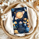 Enchanting Design: Navy-blue background adorned with twinkling stars, planets, and a playful rocket ship, seamlessly matching your space theme.