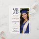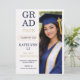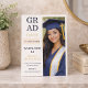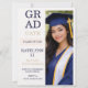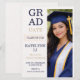 Modern split layout design featuring a cream textured background, bold stacked graduate typography, and a vertical portrait panel in navy and champagne tones. Designed for high school commencement announcements that highlight a senior portrait while sharing ceremony and celebration details.