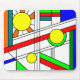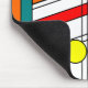 This mouse pad has a mid-century modern design of a stained-glass look with black lines and circles filled with primary and secondary colors.