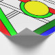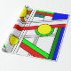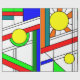 This wrapping paper mid-century modern design has a stained-glass look ith black lines and circles filled with primary and secondary colors.