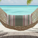 This outdoor lumbar pillow features vertical stripes of varying widths in sage green, light and dark dusty rose, gray and white. An ideal summer pattern for patio, deck, or porch.