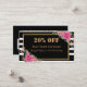 Modern elegant classy black and white stripes with golden border cute watercolor pink flowers and back side QR code discount business card on white background. You can easily change all details, fonts, colour, size and background colour,front and back both sides. Replace your own QR code to your website on social media account.