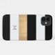 Elegant iPhone 11 case, with a modern bold white, black and gold horizontal striped pattern. Personalize the one letter monogram as a great gift idea.