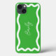 Modern stylish monogram bright green iPhone case with wave style border. Stylish handwritten style script custom name. Select from barely there or tough style cases and protect your iPhone in style.