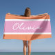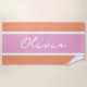 This Striped Pink and Orange Custom Name Beach Towel features an orange, pink and white simple striped background. Personalize it with your name, in a simple, stylish white script font.