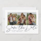 With three vertical photos and a modern script written "save the date," this card is the perfect way to announce your engagement and upcoming wedding to friends and family. The chic navy blue text is bold and modern but still sophisticated. The customizable text on the front has room for names, date, location and other information like a wedding website. The back is a matching navy and white striped pattern. The color is editable by clicking "Customize."