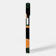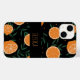 This summer themed phone case design features a fruit pattern of oranges, and green leaves on a dark black background. This makes a great gift for a friend or family member, and you can personalize this item with a custom name in the center.