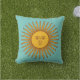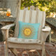 Welcome your guests to your summer solstice with this outdoor pillow. Set on your porch seating area or another outdoor living space. This pillow features a turquoise blue background with a gold sun in the center. The backside has a sun pattern.