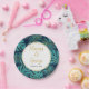 Modern teal, navy blue and gold tropical leaves wedding paper plate. The elements of this beautiful design are leaves of Split Leaf Philodendron (Monstera deliciosa) or Swiss Cheese Plant and palm leaves in teal blue with gold outline and your text in a white frame with gold outline. The background is of navy blue color.
