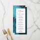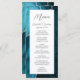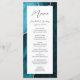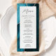 This elegant, modern wedding menu features a watercolor teal blue agate background trimmed with silver faux glitter. The text appears in elegant charcoal gray handwriting and sans serif fonts on a white rectangle. The agate design is repeated on the reverse.