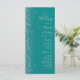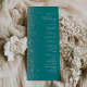 The left-hand edge of this elegant modern wedding program features a silver faux glitter design. The customizable text combines silver gray handwriting, copperplate and italic fonts on a teal blue background.