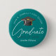 This modern teal custom senior graduate button features your high school or college name for the class of 2025. Customize with your graduating year under the chic handwritten script and grey grad cap for a great personalized graduation party favor.