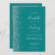 The left-hand edge of this elegant modern wedding invitation features a silver faux glitter design. The customizable text combines silver gray handwriting, copperplate and italic fonts on a teal blue background. Add your favorite photo to the reverse side, along with additional text and a QR code to send guests to your wedding website.