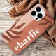 Modern phone case with your custom name aligned vertically to the right on a terracotta brown background and darker terracotta leaves.
