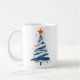 This vibrant illustration features a modern and stylized Christmas tree created with blue brush strokes arranged in a triangular shape to represent the branches. An orange star tops the tree, while various orange and blue dots are scattered around, resembling ornaments or lights. The minimalistic and abstract design captures the festive spirit with a contemporary twist, making it a unique and elegant holiday decoration