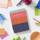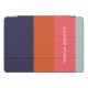 This stylish iPad case features a modern geometric color block striped design in a bold color palette of teal, red, dark pink, and navy blue, personalized with your name. Great gift idea!