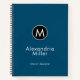 Modern notebook features a minimal design in a trendy blue color palette with with black with white accents. Custom name and title presented in stylish simple font with a complimentary minimal monogram medallion.