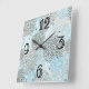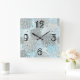 A modern feminine floral pattern in shades of blue and gray with black whimsical clock numbers.