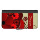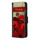 © Sunny Mars Designs. Beautiful, elegant, stylish, trendy, modern girly red floral custom iPhone Vegan Leather Wallet Case Covers with pretty, chic crimson or maroon swirly tropical flower design on customizable background. Personalize it by adding your own name or other text on it.