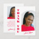 Fun, modern, elegant bright pink script lays over a rich white background and around your graduate's photo. On the back is another photo and your thank you text. You can add your own photos and text by following the "Personalize this template" link. You can edit further if you wish, including colors. If you would like assistance, please reach out to me via message on this site. I will be happy to help!