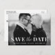 Modern Trendy Save The Date Black and White Photo Postcard with block script and calligraphy script combination.