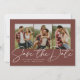 With three vertical photos and a modern script written "save the date," this card is the perfect way to announce your engagement and upcoming wedding to friends and family. The chic white text is bold and modern but still sophisticated. The customizable text on the front has room for names, date, location and other information like a wedding website. The back is a matching terracotta and white striped pattern. The color is editable by clicking "Customize."