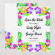 This elegant tropical wedding save the date invitation is perfect for a modern summer wedding. The simple design features bloom yellow, purple, and pink flowers with elegant black typography on a white background.