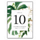 Elegant tropical table number cards featuring the table number and your wedding details framed by a border of watercolor tropical leaves in shades of green complimented by gold foliage. Personalize by adding your names and wedding date. The design repeats on the back of the card. Designed to coordinate with our Tropical Gold wedding collection.