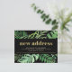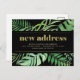 This trendy tropical change of address postcard features a frame of modern monstera and other green tropical leaves with faux gold lines on a dark, black background. The words "new address" appear in trendy, contemporary faux gold typography. A simple yet stylish moving announcement that you'll be proud to send to friends and family.