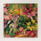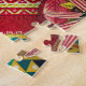 Complex combination of Indian fabric prints, bright pink and purple flowers, vibrant yellow flowers and lots of tropical botanical greenery create a challenging jigsaw puzzle for adults.