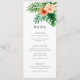 Modern yet elegant wedding menu design featuring watercolor tropical leaves and hibiscus flowers on a white background. Reverse side of the card is in deep green color.