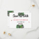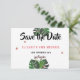 Festival theme Wedding Save the Date. Featuring green foliage with Monsteria leaves and pink flower buds.