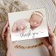 Elegant Modern Calligraphy Script Newborn Baby Photo Thank You Postcard. Features a beautiful "thank you" text in a handwritten calligraphy swash tail font script in gray. At the reverse side pre-made personal message in black and white. Easy to personalize with your baby photo and details.
