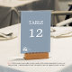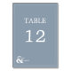 A modern and unique wedding table number including the name of the bride and groom in dusty blue. Personalize your own Dusty Blue wedding with this design and color in our collection.