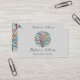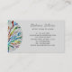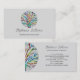 This modern and unique meditation teacher business card is decorated with a colorful mosaic tree of life design and stylish script typography on a gray background.