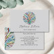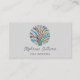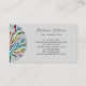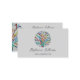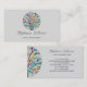This modern and unique yoga instructor business card is decorated with a colorful mosaic tree of life design and stylish script typography on a gray background.