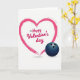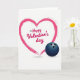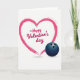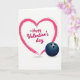 This Valentine's Day card features a large fuchsia pink heart painted with loose brushstroke texture on a bright white background, giving it an easy, modern look. Inside the heart, “Happy Valentine’s Day” sits centered in rich magenta lettering, with the words arranged to fill the shape comfortably and read clearly. A small arrow in matching magenta points into the phrase, adding a flirty cue that feels like a sweet nudge between two people 🥰. The open white space around the heart keeps the focus on the message and makes the pink tones stand out without feeling busy. Tucked under the lower-right curve of the heart is a deep indigo bowling ball, suggesting a date night or shared hobby alongside the romance ❤️. The ball has a glossy highlight and three finger holes that are easy to spot, giving it a realistic, slightly three-dimensional look. A soft gray shadow beneath the heart and ball anchors everything on the white field, with the ball overlapping the heart’s edge at the bottom right.