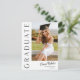 This modern elegant stylish photo graduation invitation features a vertical photo and headline with customizable script name and text on the front. The back has an invitation with party details and a second photo. A great way to showcase your graduate. Click the edit button to personalize this design.