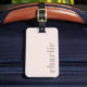 Modern, minimal luggage tag with your custom name or text aligned vertically to the right on a very light, muted pink background.