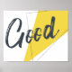 Modern, vibrant, bold, playful graphic design of a word "Good" with triangles in yellow and grey colors. Handwritten, brush stroke style typography.