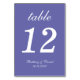 A simple wedding table number for a violet wedding color. It is just white text on a purple background. Everything except the number itself is written in an elegant calligraphic script.