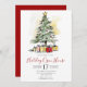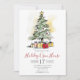 This modern watercolor Christmas tree Open House invitation with a gorgeous Christmas tree decorated with red and gold balls and with a sprinkling of brightly wrapped presents below would be perfect for inviting friends and family for a holiday open house. The templates are super easy to use and in seconds you can see your fabulous invitations.