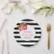 Modern and chic floral wedding paper plate featuring a black and white striped pattern, a white circle in the center with your text and pretty watercolor tropical flowers in pink and purple. It is a perfect choice for your wedding bridal shower or party table.