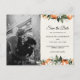 Announce your wedding in style with this elegant Save the Date postcard featuring a split layout with your favorite photo on one side and a stunning watercolor orange floral border on the other. The natural leaf accents and warm citrus tones offer a romantic, Mediterranean-inspired feel — perfect for spring or summer weddings. Easily personalize with your names, date, and details. A beautiful and affordable way to spread the joy of your big day.