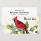 Modern funeral thank you card featuring a striking red watercolor cardinal sittng on a tree branch with the text 'thankyou', and on the back is a personalized sympathy appreciation template.