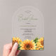 Stylish boho floral botanical bridal shower party trendy arch shape acrylic transparent invitation card template featuring yellow gold watercolor sunflowers with greenery foliage and an elegant chic hand-lettered calligraphy script.+++++++++++ Easy to personalize with your details! +++++++++++ The invitation is suitable for spring summer or autumn fall outdoor garden rustic bridal showers, brunch, or luncheon parties. +++ Double-check all the information and spelling of your text because you will receive exactly what you see - no one else will check anything before printing. ++++++ You can choose between transparent and opaque options.