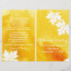 Modern abstract watercolor yellow wedding ceremony and party folded program featuring a hand painted watercolor paint splash with texture in tones of yellow and burnt orange, maple leaves in white with pale yellow veins and text in white. This elegant and stylish casual wedding design is a completely customizable template perfect for your spring, summer or fall/autumn wedding. You will have to fold it in the center. Choose only this type of paper-value as it folds well. Note that this is only an image of watercolor and not real texture.