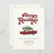 Modern Retro Change of address postcard for the holidays! A cute car and Christmas Tree Illustration and vintage typography reading ' Merry Christmas from our new address ' in a red and green design. On the back is space for a custom message, season's greetings, and a festive star.