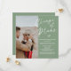 Modern rustic photo design with sage green backdrop that quickly and easily notifies guests and loved ones of your wedding change of plans, and reschedule date. The template is fully editable that you can replace with your personal photo, names, new dates, and other important details.